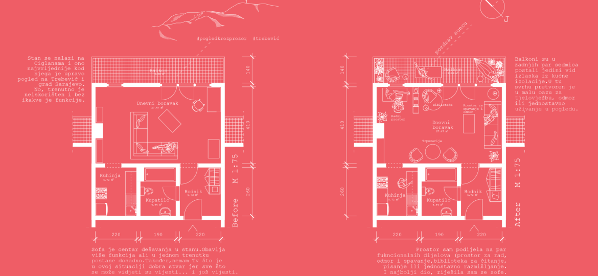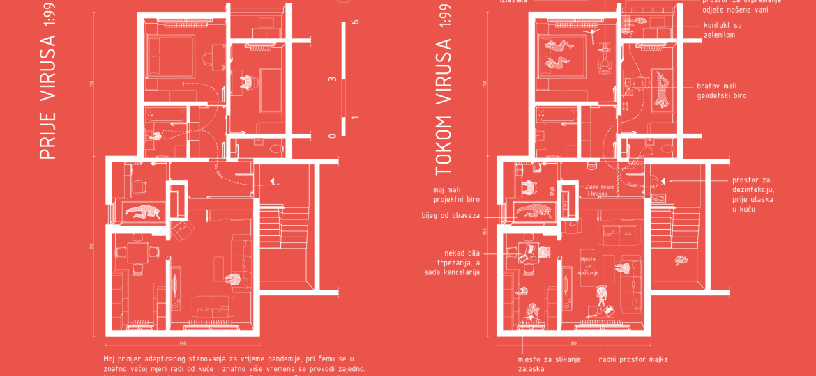 Nekada krizni periodi, strah i neizvjesnost mogu „izbaciti na površinu“ iznimno kvalitetne ideje. Upravo je dobro sročeni neformalni zadatak transformiranja sopstvenog prebivališta u višenamjensku karantinsku zonu potaknuo studente Arhitektonskog fakulteta na kreativno promišljanje. Ove radove treba iščitavati kao individualne scenarije, u kojem vas svaki autor vodi originalnom arhitektonskom stazom kroz koju se provlači zajedničko pitanje. Na koji način u limitiranom unutarnjem prostoru možemo nadomjestiti sve one aktivnosti koje su se do prije par mjeseci odvijale izvan zidova stana?