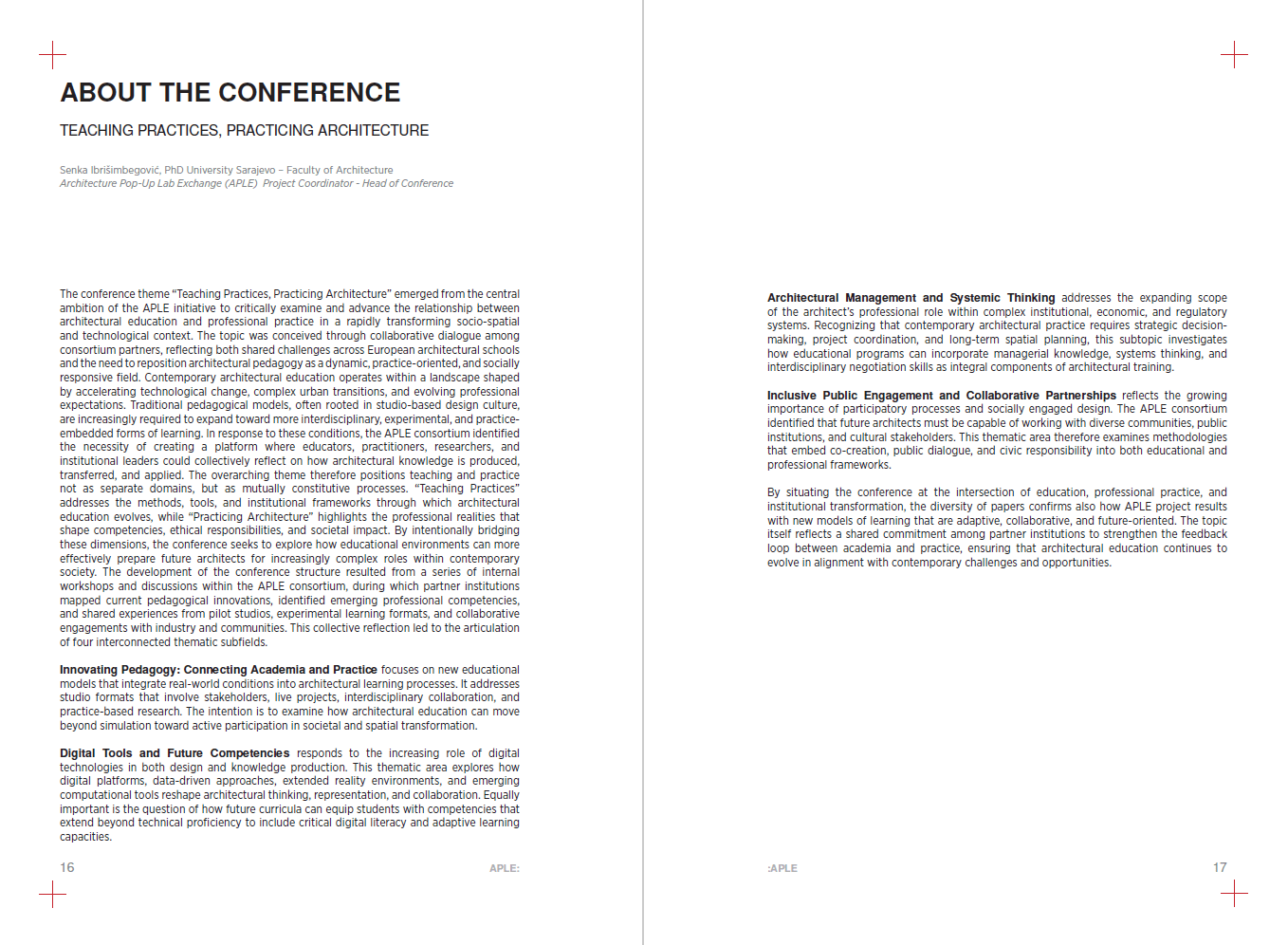 The collected papers reflect the research, knowledge exchange, and pedagogical experiences developed throughout the APLE project and its partner institutions. By documenting these contributions, the proceedings aim to support the dissemination of ideas, methods, and educational experiments that respond to contemporary challenges in architectural pedagogy.