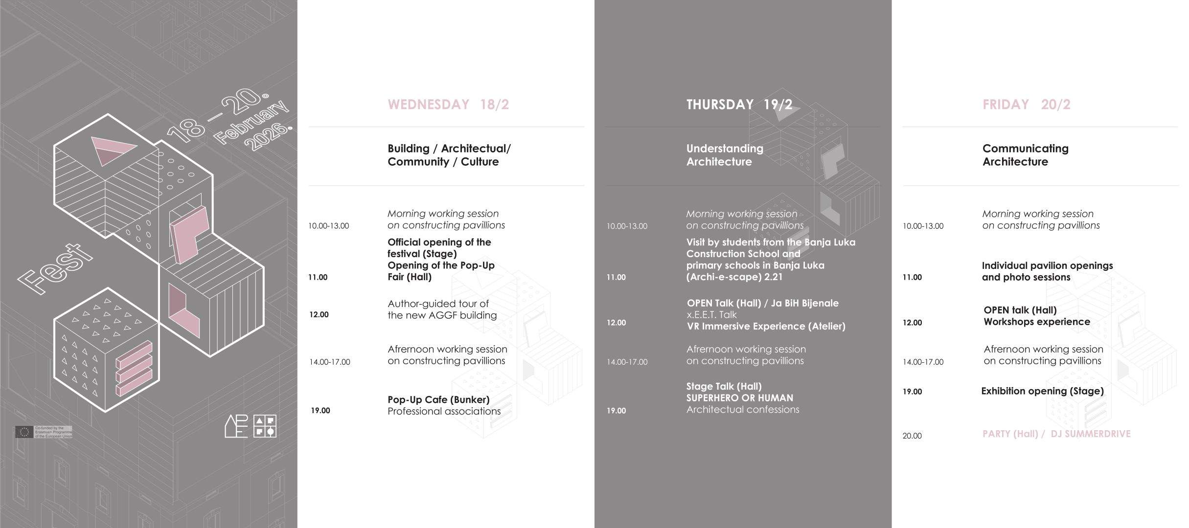 APLE Fest transformiše novu zgradu AGGF-a u otvorenu kuću arhitekture u kojoj se kroz izložbe, razgovore, prezentacije i radionice predstavljaju inovativni modeli učenja kroz rad, razvijeni u okviru Erasmus+ APLE projekta. APLE Fest simulira Pop-Up Live Studio – u kojem, na izgradnji pet arhitektonskih paviljona, učestvuje 30 studenata i nastavnika sa sedam arhitektonskih fakulteta (iz Trondhajma, Rima, Zagreba, Podgorice, Mostara, Sarajeva i Banje Luke); Pop-Up Fair, sa partnerima iz privrede; Pop-Up Cafe sa temom građenja zajednice arhitekata; OPEN Talks i STAGE Talks, koji tematizuju razumijevanje i komunikaciju arhitekture; te stručna vođenja, posjete i radionice (Archi-e-scape, VR) sa učenicima srednjih i osnovnih škola.
