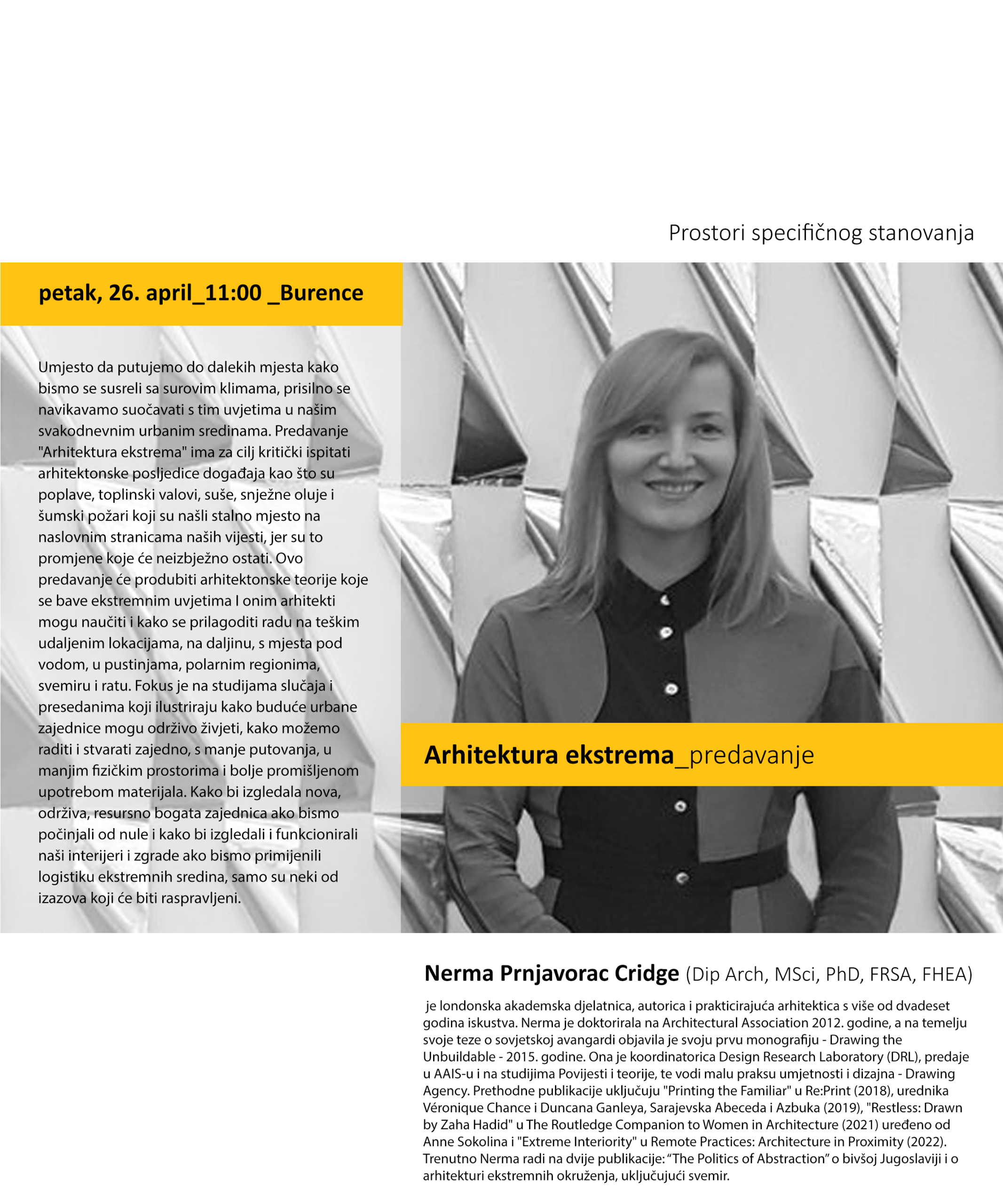 Čast nam je pozvati vas na predavanje kolegice Nerme Prnjavorac Cridge pod naslovom “Arhitektura ekstrema” koje će se održati u sali “Burence” u petak, 26.04.2024. sa početkom u 11:00 sati u okviru nastave na nastavnom predmetu “Prostori specifičnog stanovanja”. Tema predavanja su staništa koja karakteriziraju teški uvjeti okoliša – ekstremni ambijenti – koji postaju norma. Umjesto da putujemo do dalekih mjesta kako bismo se susreli sa surovim klimama, prisilno se navikavamo suočavati s tim uvjetima u našim svakodnevnim urbanim sredinama.