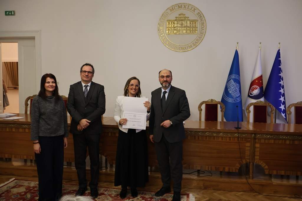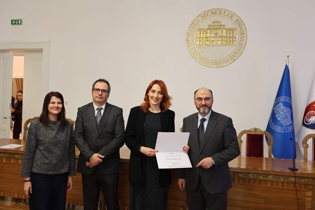 Među nagrađenima je i Doc. dr. Lejla Kahrović-Handžić sa Arhitektonskog fakulteta Univerziteta u Sarajevu, koja je dobitnica nagrade za izuzetan naučno-istraživački rad u 2024. godini. Posebno priznanje Univerziteta dodijeljeno je i monografiji „Univerzitet u Sarajevu – Arhitektonski fakultet 1949-2024: 75 godina obrazovanja arhitekata u Bosni i Hercegovini“, koja je osvojila Nagradu za monografiju od posebnog naučnog i nacionalnog značaja na bosansko-hercegovačkom jeziku za 2024. godinu. Ovu prestižnu nagradu preuzela je glavna i odgovorna urednica monografije, V. Prof. dr. Nermina Zagora.